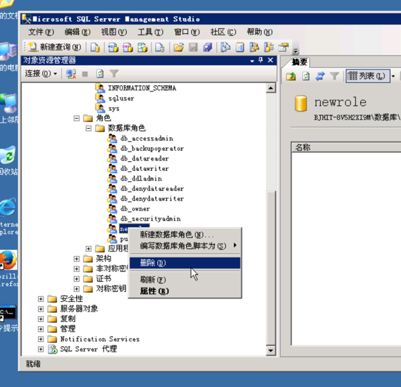 在SQL Server Management Studio中,用鼠标右键单击要删除的自定义角色,如NewRole,从弹出的菜单中选择“删除”命令即可删除自定义角色。