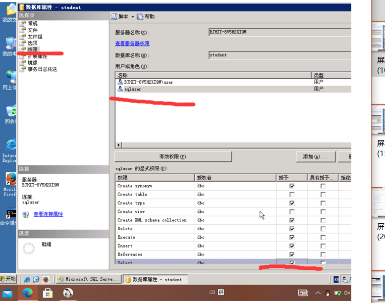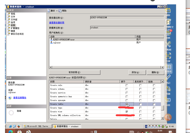 启动SQL Server Management Studio,展开实例数据库,右击student数据库,在弹出的快捷菜单中选择“属性”,然后选择“权限”选项卡。在用户WinUser一栏中,将“创建表”和“创建视图”选中.