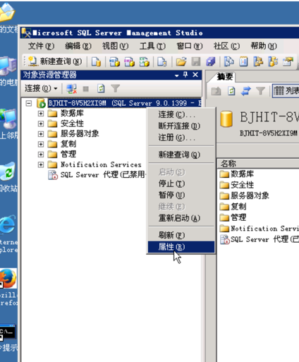 ④在“对象资源管理器”中,右击服务器,然后单击“属性”。