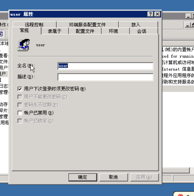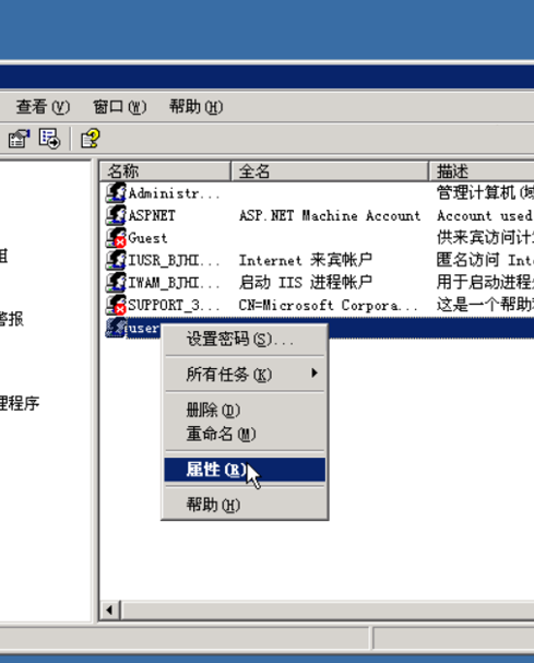 用鼠标右键单击要修改的用户,在系统弹出菜单上单击“属性”