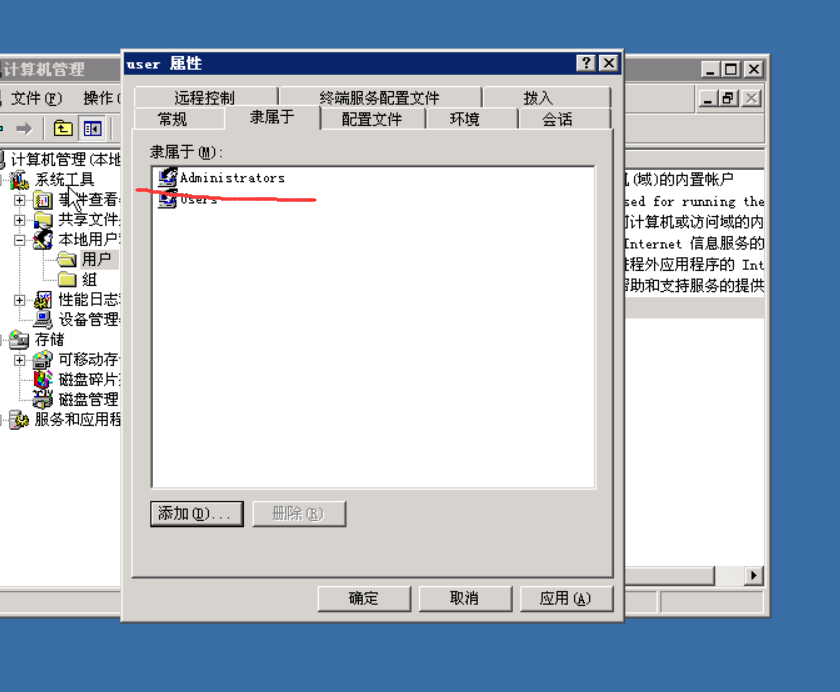 同样点击确定。此时,在winuser属性的隶属于选项卡下可以看到,多了一个administrators。