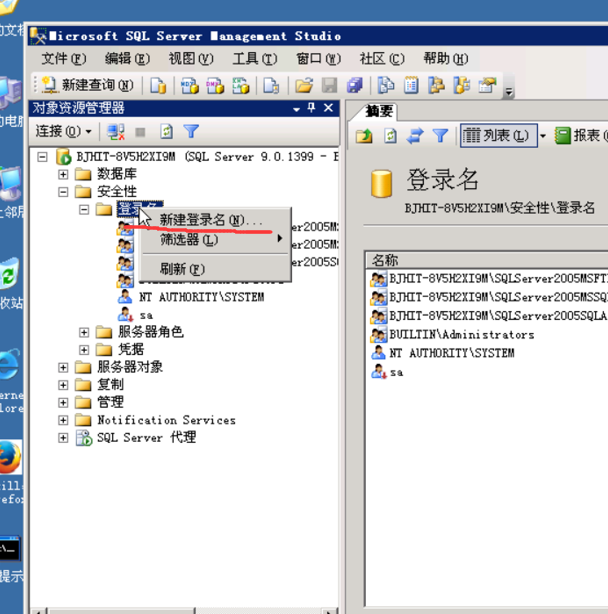 展开实例下的“安全性”,右击“登录名”按钮,在弹出的快捷菜单中选择“新建登录”。