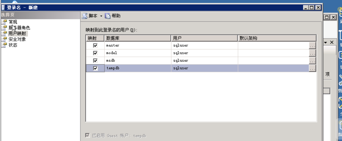 ③单击“用户映射”,在“映射到此用登录名的用户”中,将所有数据库都选中,下方的数据库角色成员身份全部选择public,然后单击确定完成账号的创建。