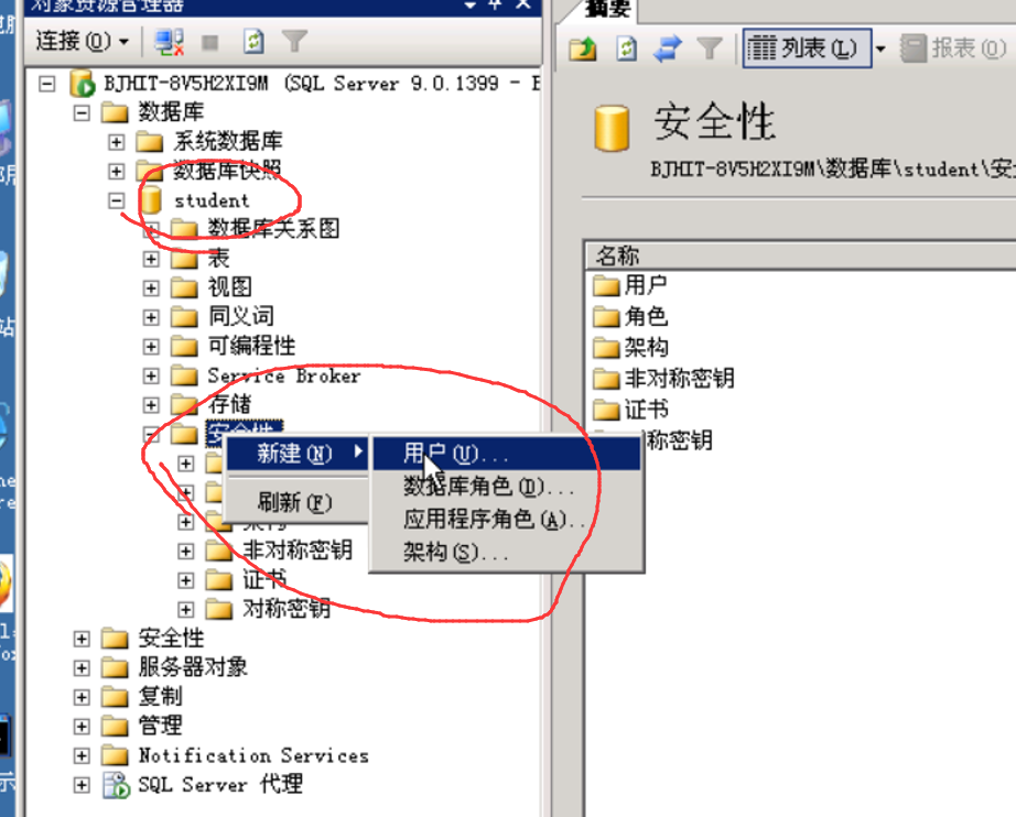 打开SQL Server Management Studio,展开服务器-数据库,选择要创建用户的数据库,如student,展开student,用鼠标右键单击“安全性”节点,从弹出的菜单中选择“新建-用户”命令。