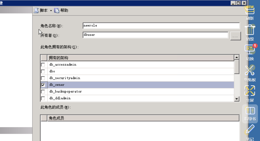 弹出“新建角色”对话框,在角色名称输入框中输入数据库新角色的名称,如NewRole,点击所有者后面的按钮