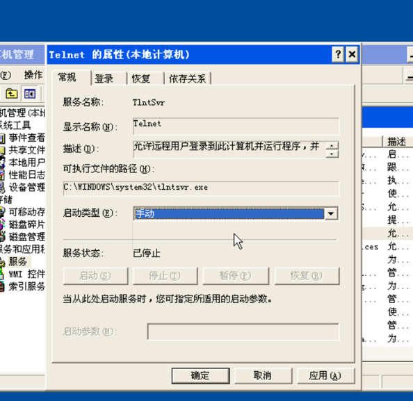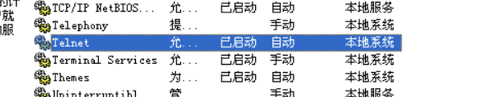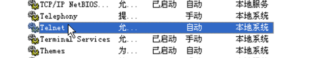 进入主机A,右键“我的电脑”->管理->服务和应用程序->服务,找到Telnet服务,如图所示: