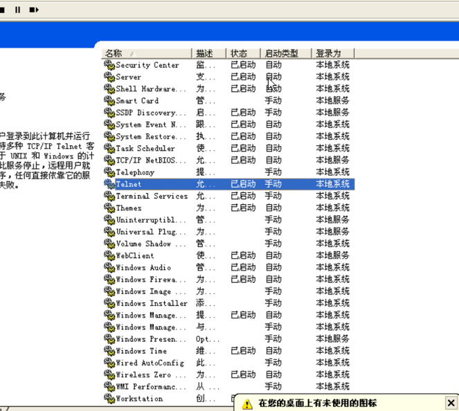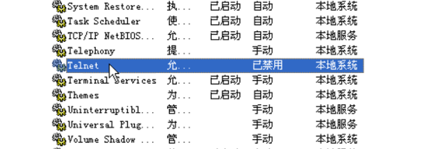(3)右键“我的电脑”->管理->服务和应用程序->服务,找到Telnet服务,关闭之: