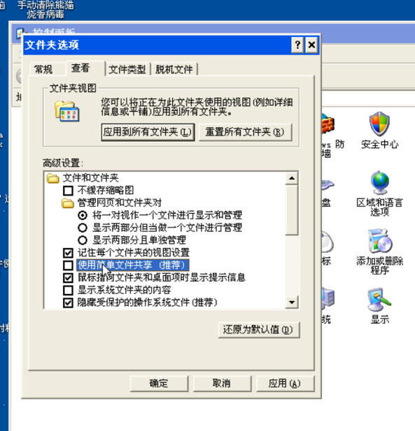 (2)在主机B的“控制面板-工具-文件夹选项-查看-简单的文件共享”去掉选取。