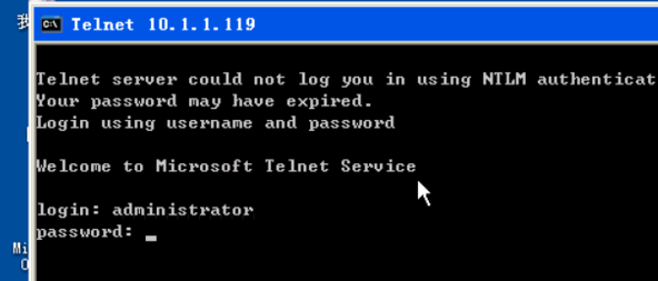 telnet连接建立之后,可输入用户名密码等相关信息进行登录,telnet服务登录到远程主机:
