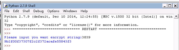 任务描述:使用任意一种语言,对特定的四位数字进行MD5加密(例如‘3839’),输出加密后的结果: