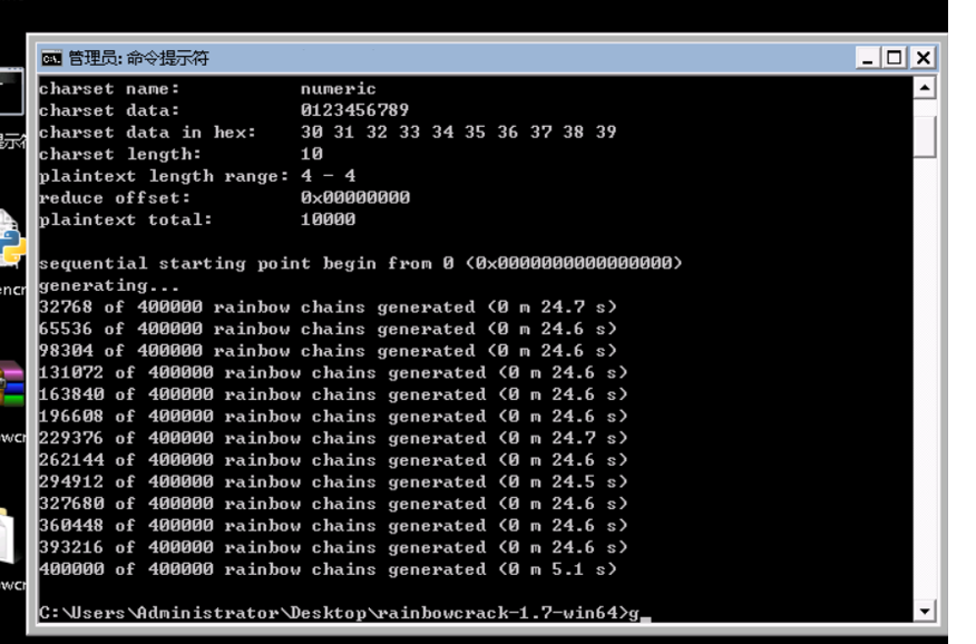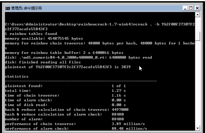 2.以攻击者的视角,通过生成相应的彩虹表来对4位数字密码MD5密文进行破解。