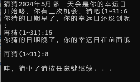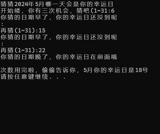 printf("猜猜2024年5月哪一天会是你的幸运日\n开始喽,你有三次机会,猜吧(1~31:");