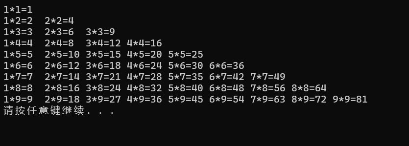 printf("%d*%d=%-3d",j,i,j*i);