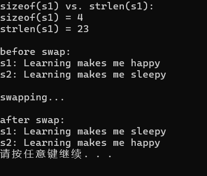 printf("sizeof(s1) vs. strlen(s1): \n");