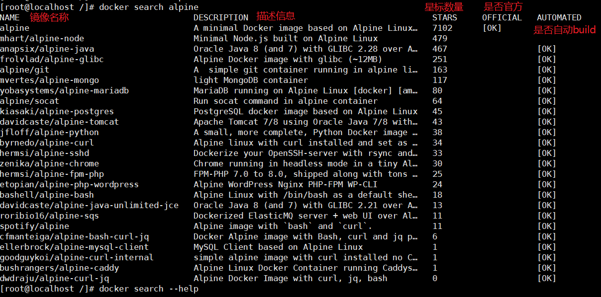 docker search --limit 10 alpine   #查找10条记录