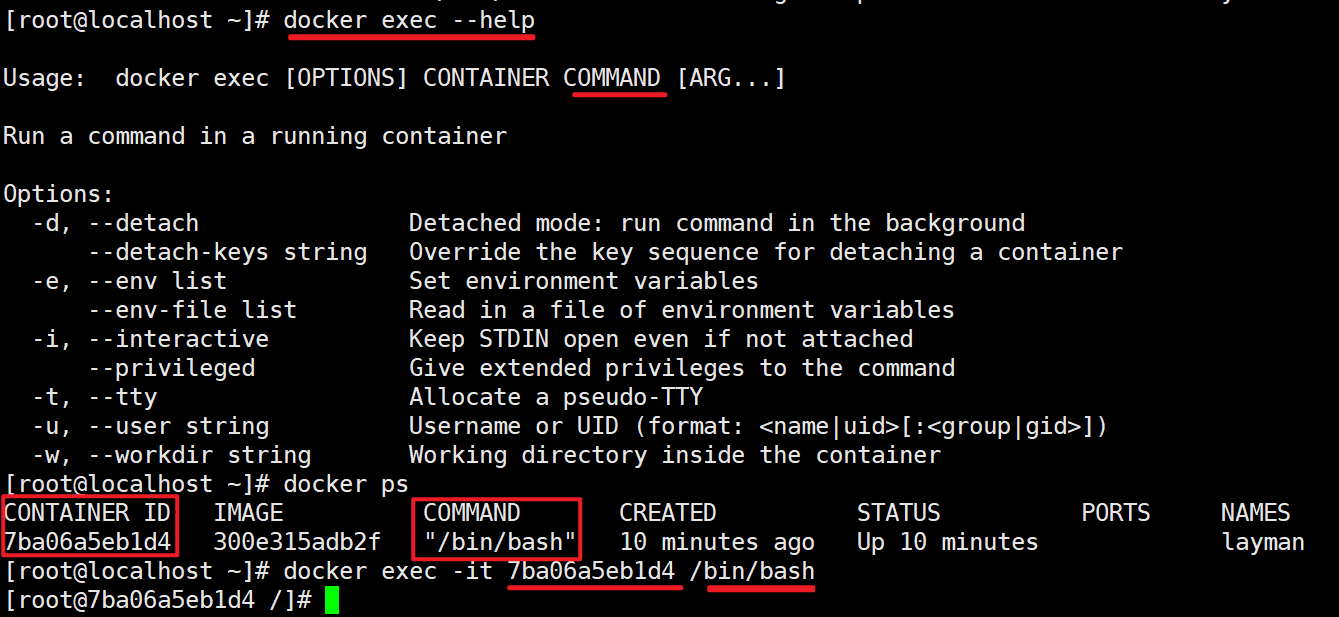 docker exec -it 容器id command  #启动一个伪终端以交互式的方式进入某个容器(使用exit退出后容器不会停止运行)容器是在镜像上封装的一层薄薄的读写层,它的本质仍是操作镜像.