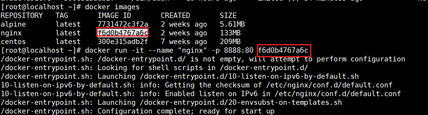 docker run -it --name "nginx" -p 8888:80 f6d0b4767a6c删除镜像