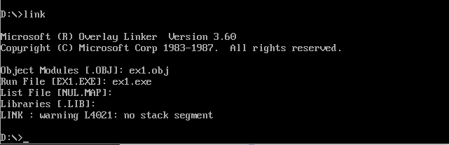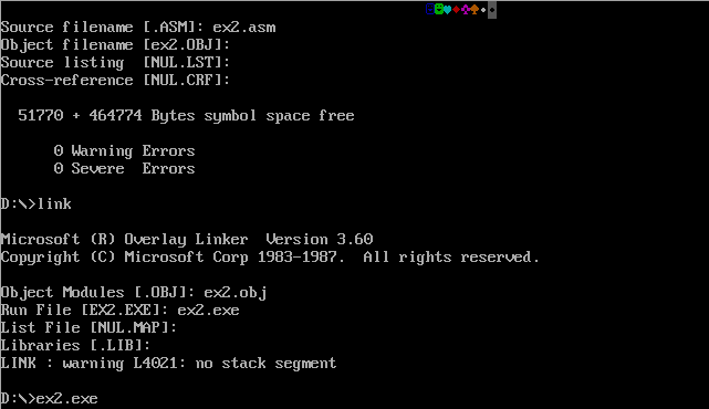 最后一行有提示信息:no stack segment,在网上查了意思,得知是:程序中没有安排堆栈段。这个警告可以忽略,程序能够运行,并且得到正确的结果。