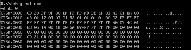 使用debug加载可执行文件ex1.exe后,使用d命令查看程序段前缀PSP所占的256个字节。