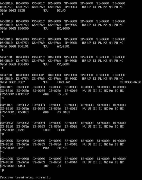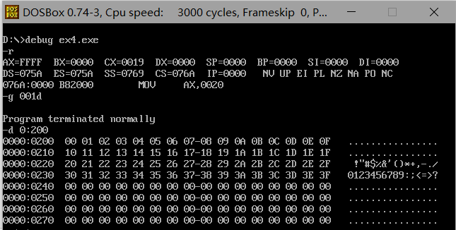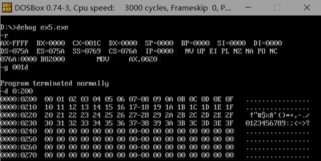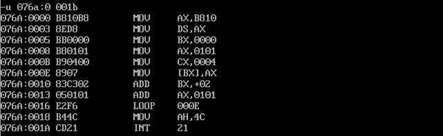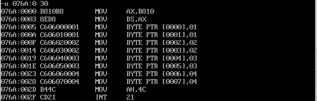assume cs:code code segment mov ax, 20h mov ds, ax mov bx, 0 mov cx, 40h mov al, 0 s:mov [bx], al inc al inc bx loop s mov ax, 4c00h int 21h code ends end