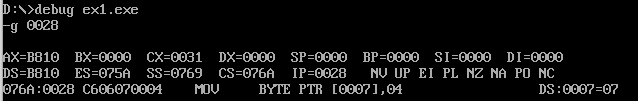 要求:使用8086汇编程序编写、汇编、链接、运行、调试方法,对ex1.asm进行汇编、链接、运行,使用debug工具调试可执行文件。