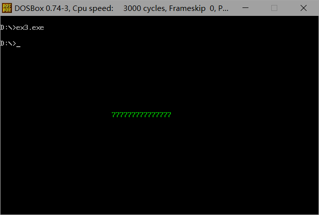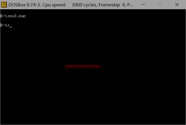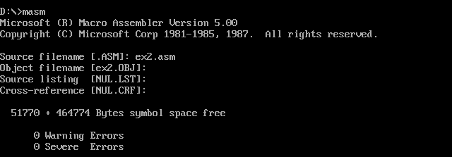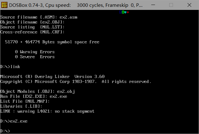 使用masm、link对ex2.asm进行汇编、链接,得到可执行文件ex2.exe,运行并观察结果。