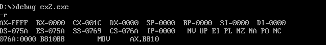 首先可以结合可执行文件中寄存器CX的值,使用u命令对ex2.exe进行精确反汇编,和之前的操作步骤一样,先使用r命令查看相关信息: