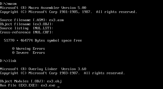 使用masm、link对ex1.asm进行汇编、链接,得到可执行文件ex1.exe,运行并观察结果。