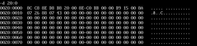 首先使用d命令查看程序段前缀PSP所占的256个字节,结果如下图所示: