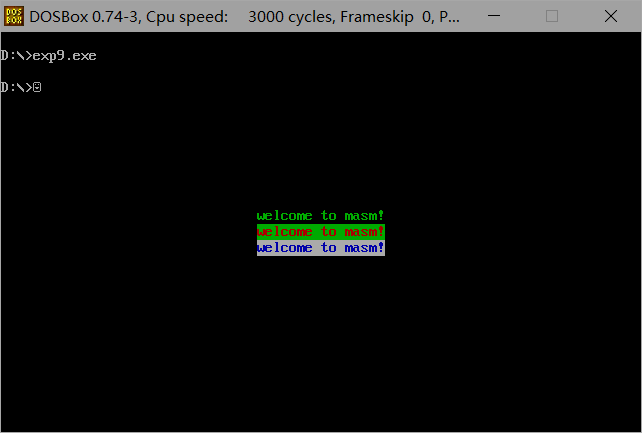 使用masm、link对exp9.asm进行汇编、链接,得到可执行文件exp9.exe,运行并观察结果。