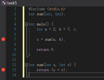 在line7和line13处添加断点,如图所示: