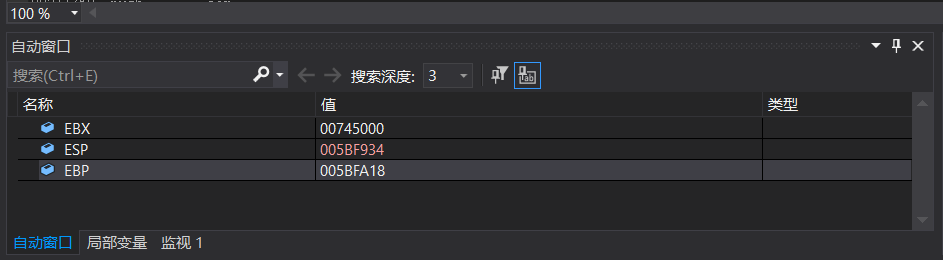 函 数的“{”被认为是分配局部变量空间的时机。在汇编层面局部变量分配体现为堆栈中以 EBP 寄存器为基址向低地址端分配的一个连续区域,通过 EBP 寄存器的相对寻址方式来寻址函数内的局部变量。由于堆栈增长的方向是高地址端到低地址端,因此函数中先定义的局部变量地址较大,后定义的变量地址逐渐变小,相邻定义的变量其地址一定相邻[2]。由于全局数据和局部数据定义在不用的数据区而并不与局部变量相邻,根据程序局部性原理,相邻的数据会被缓存,因此对相同的运算,局部变量作为操作数的运算效率就可能高于有全局变量参与的运算。同时,局部变量分配和回收只需要移动堆栈指针ESP,因此效率最高。