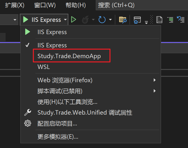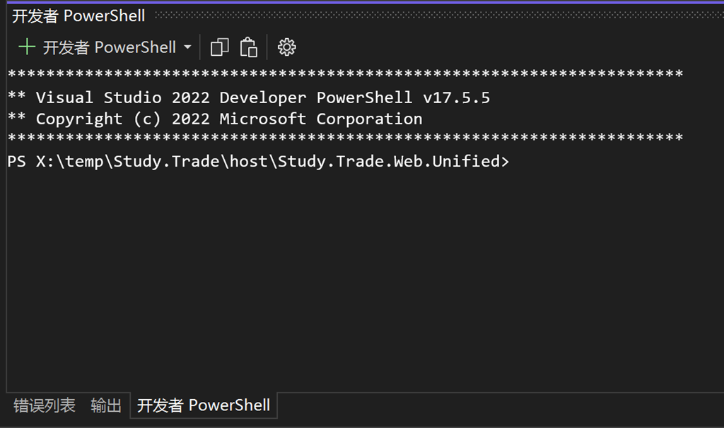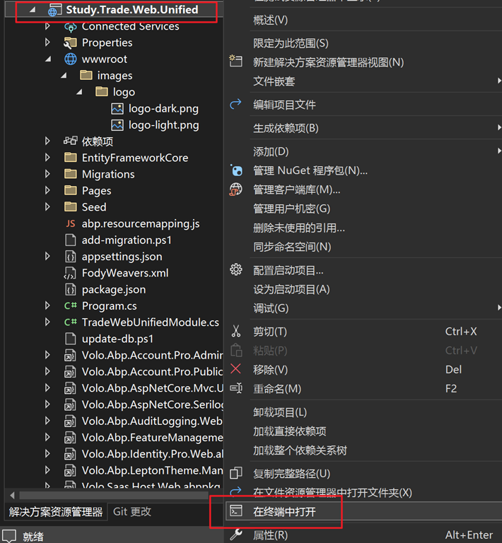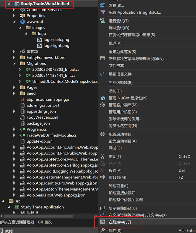 在Study.Trade.Web.Unified项目上点右键,选择“在终端中打开”
