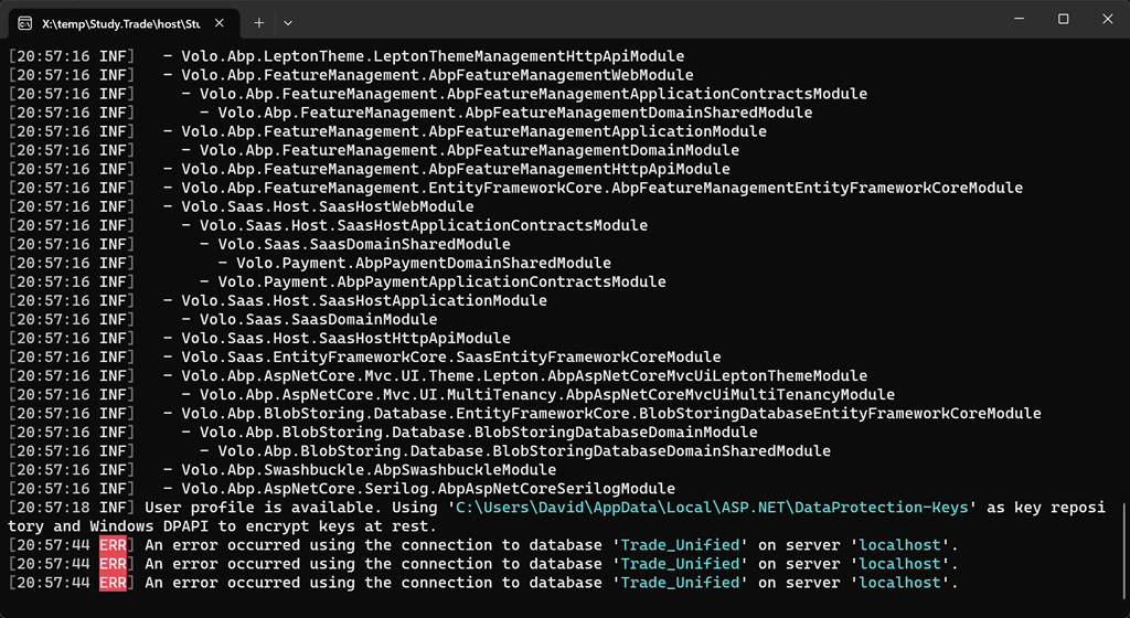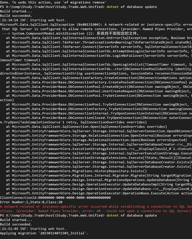 输入命令,回车后等待了很久,可能看到下图中的红色文字的错误,原因是localhost上没有SQL SERVER。去微软下载SQL SERVER 2019 Developer Edition,安装后再次运行上述命令。完整截图如下: