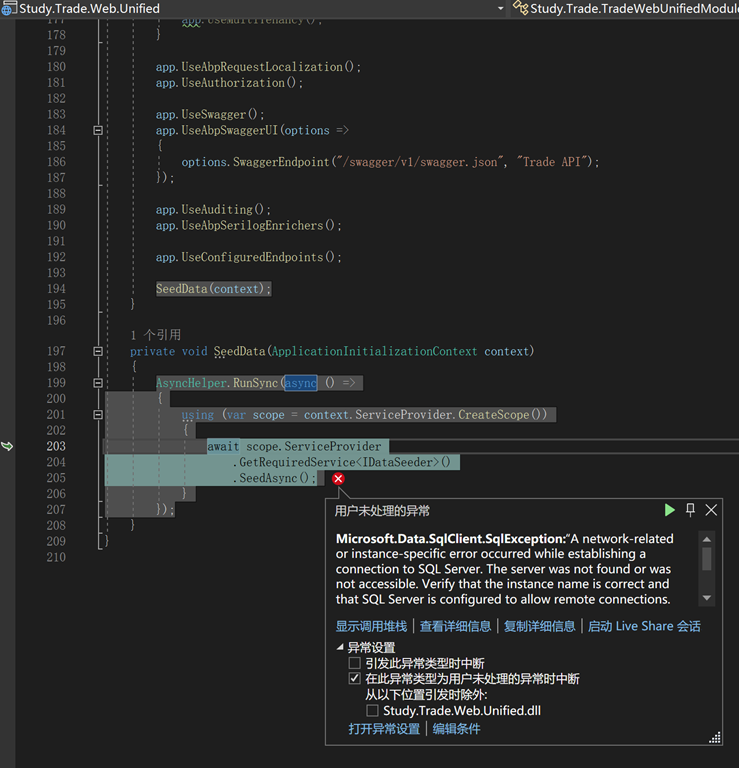 异常信息提示的很清楚:没有Trade_Unified数据库。