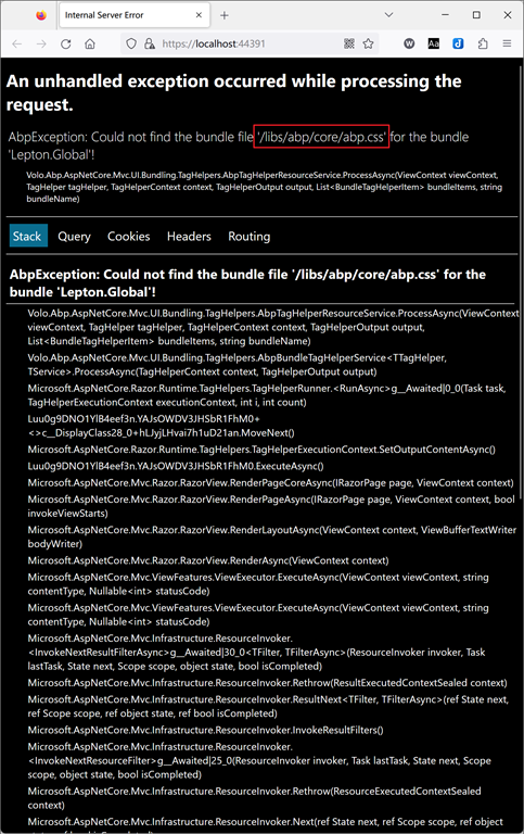 14、依然报错,提示缺少文件。就是wwwroot的libs目录都不存在。