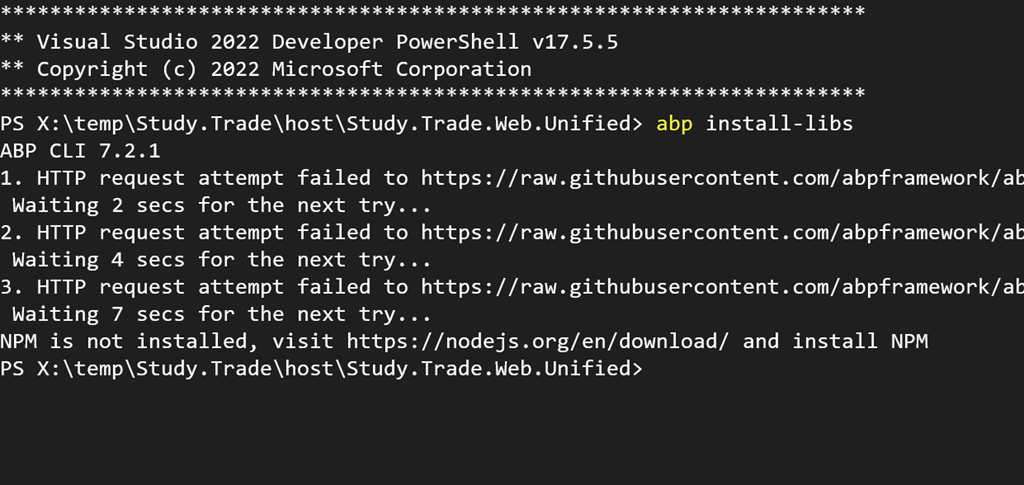上一篇文章报错,因为npm功能没有安装,导致Web.Unified.Host的wwwroot下没有libs目录。