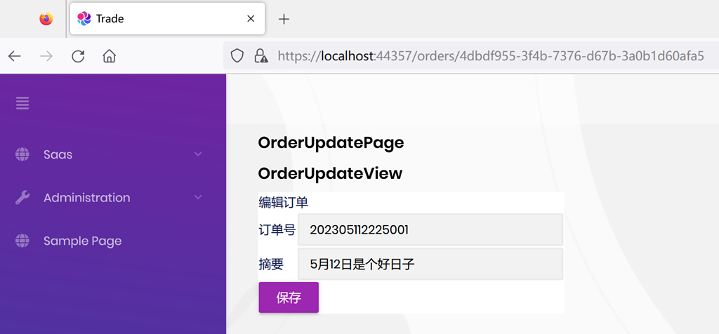 8、在页面合适的区域放置OrderUpdateView,并且把URL中的OrderID,传递给OrderUpdateView组件