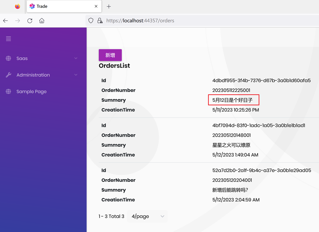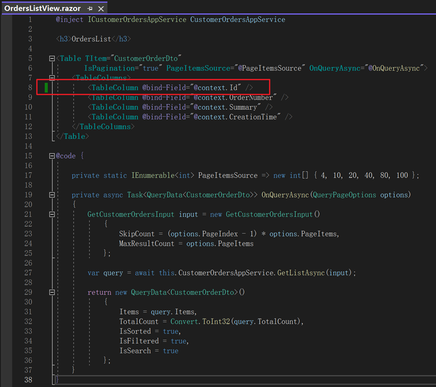 因为先前为了直接在浏览器里输入订单的Guid,所以修改了订单列表的视图,增加了显示Id的列: