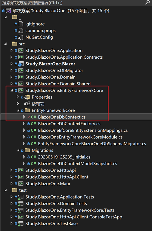 # 1、修改EntityFrameworkCore项目下的BlazorOneDbContext文件,增加一行代码即可