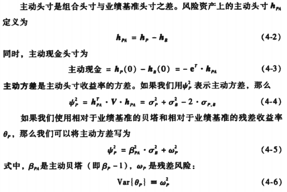 在这里,我们将前面提到的市场组合换成某个业绩基准,主动投资经理的业绩是相对于其业绩基准而言的,主动收益率就是其投资组合收益率与基准组合收益率之差。