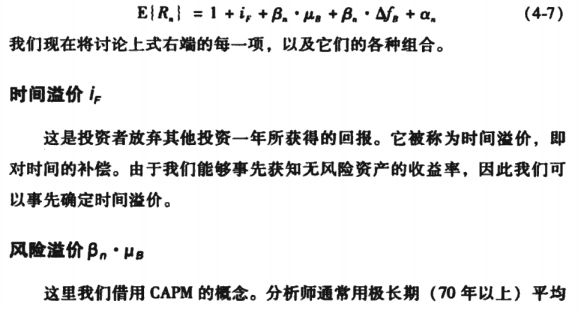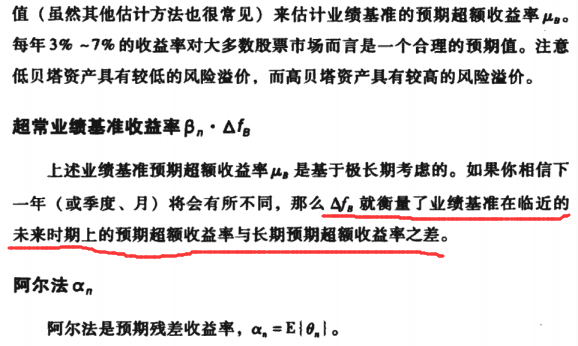 对于一个资产n而言,我们可以将其预期收益率分解为四部分:无风险部分(时间溢价)、业绩基准部分(风险溢价)、基准择时部分(超常业绩基准收益率,反映了基准择时收益,是f减去μ的值)、阿尔法部分(预期残差收益率,反映了选股收益)。风险溢价被认为是一致预期超额收益率;基准择时部分+阿尔法部分被认为是预期超常收益率;风险溢价+基准择时部分+阿尔法部分被认为是预期超额收益率。即: