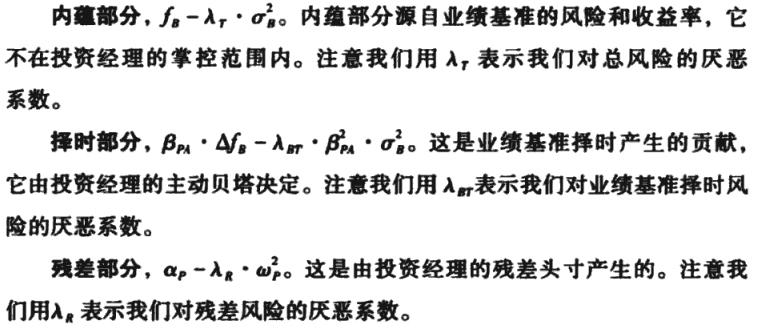 Markowitz、Sharpe、Metron等人奠基的现代投资组合理论是投资经理在风险和预期收益率之间做的权衡,并在其中使用效用函数选择满足效用最大化的投资组合,但这种标准往往导致较高的残差风险(原因是对于所有风险都使用了相同的厌恶程度,但是事实上投资经理对残差风险的厌恶程度没有对据准组合风险的厌恶程度那么高,具体见《主动投资组合管理》),我们可以重新建立主动投资经理的目标函数,将风险和收益率拆解为以下部分: