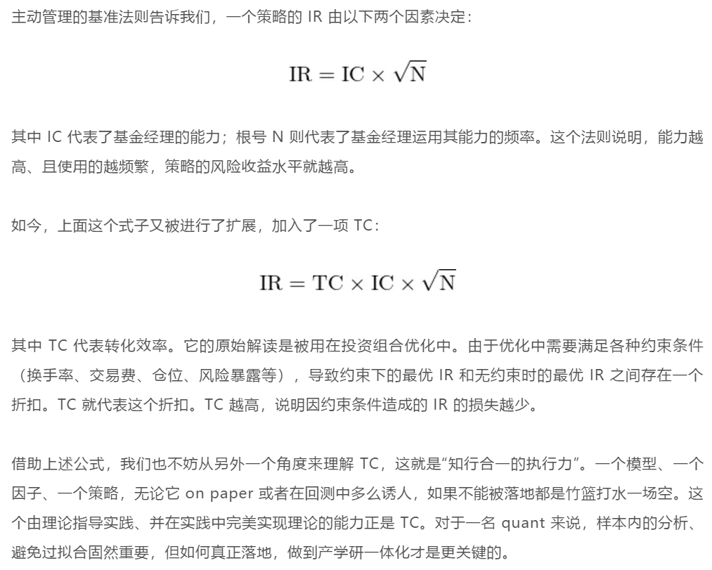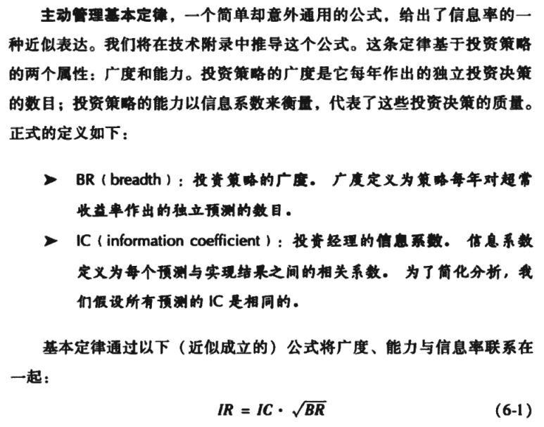 也就是说如果我们想要获得比较好的主动投资管理效果,首先我们需要比较好的预测能力(IC),同时我们需要把这种预测能力用到比较多的股票中,且较频繁(BR)。