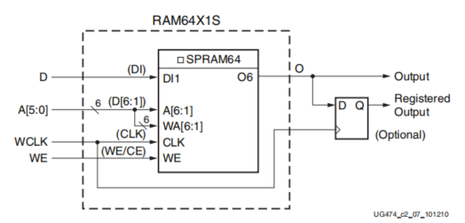 一个LUT可以作为64x1bits的RAM(内存大小为64bit,1bit读写),地址为6位。当读写地址共用一个端口时为单端口RAM,不共用时则为双端口RAM(由图中可以看出SLICEM里面第一个LUT的WA与A是连在一起的,故第一个LUT做不了双端口RAM)。输出数据可以经过SLICEM里面的Register资源打一拍以提高时序特性。64bit单端口RAM LUT实现及原语如下图: