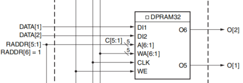 或者作为32x2bits的RAM(2bit读写),地址为5位,A[6]拉高。输出为O5,O6。