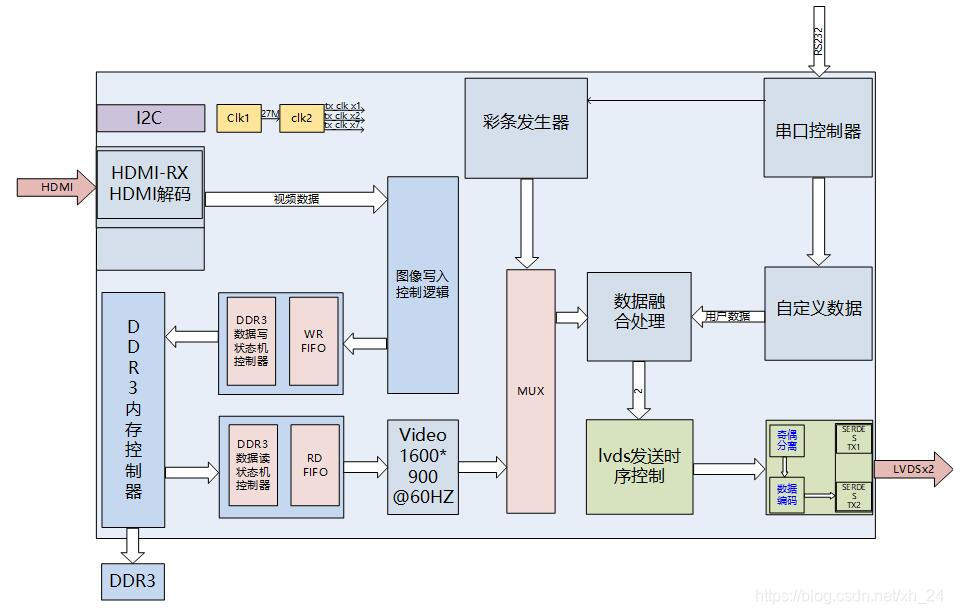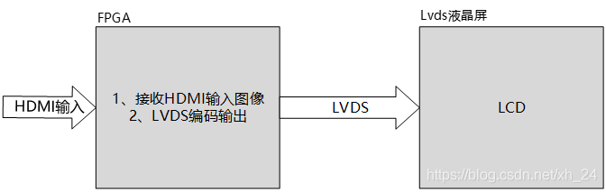 二、增加缓存进行简单的图像裁剪,主要功能是实现HDMI视频输入经FPGA转成LVDS输出,基本框图如下所示: