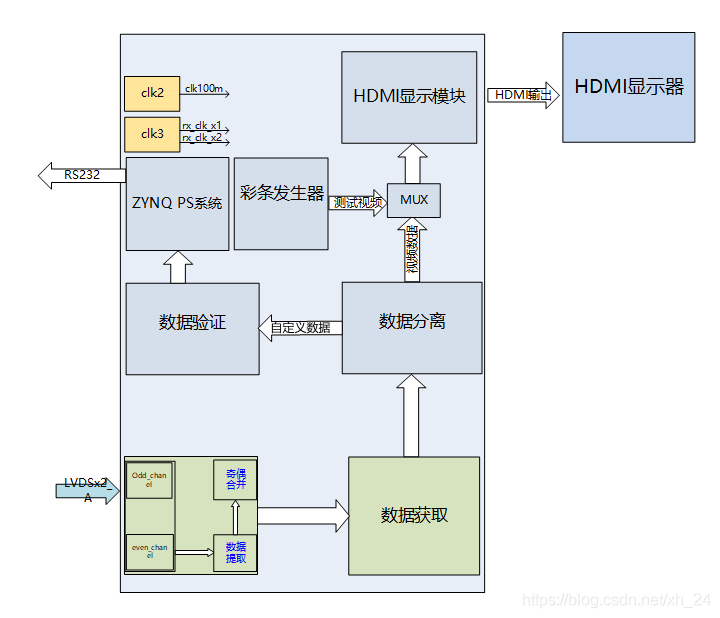 2、接收端:ZYNQ将LVDS接收到的视频数据和自定义数据进行分离,进行显示测试和数据验证;