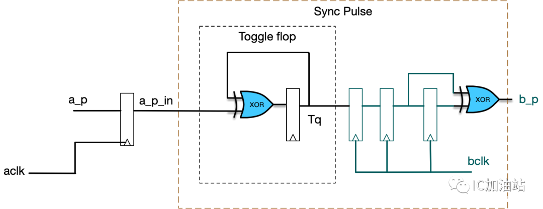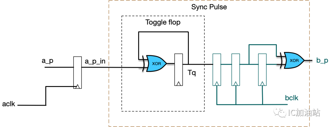 这种方法的本质实际上是将信号展宽,只不过展宽的信号可能是0也可能是1。但很显然,a时钟域的两个脉冲间隔要足够大,因为两个脉冲的信号的间隔就是a时钟域的信号持续的时间。如果这个时间太短,在b时钟域是无法采到的。两个脉冲之间的间隔要大于Tb+Thold+Tsetup,其中Tb为b时钟域的时钟周期,Thold与Tsetup分别为b时钟域寄存器的保持时间和建立时间。