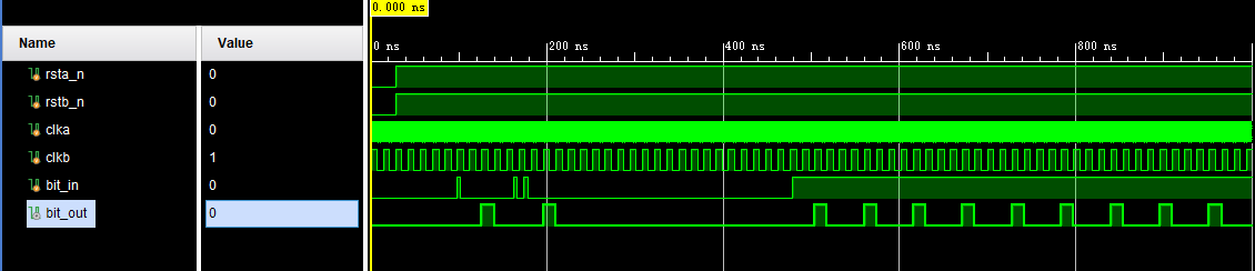 从仿真图可以看出,对于快时钟域的两个脉冲离得比较近的话,慢时钟域是会漏采的,使用握手信号时,对此需要注意。